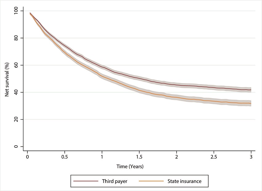 Results: The 3-year net survival was 36.8% (95% CI: 35.5-38.1). Net survival was higher in people with special insurance (61.7%; 95% CI: 44.8-74.8) or third payer (40.5%; 95% CI: 38.7-42.3) than state insurance (30.7%; 95% CI: 28.7-32.8). It was also higher in women and people diagnosed at early stages. Multivariable analysis showed consistency with survival estimations with a higher risk of death in men, people with state insurance, and diagnosed at advanced stages. In Cali, the 5-year net survival remained stable in men during the last 20 years. In women the 5-year net survival in women increased 8.60 percentage points, equivalent to a 50% increase compared to the 1998-2002 period. For 2013-17, it was 19.1% (95%CI: 16.2-22.2) in men, and 24.8% (95% CI: 20.4-29.3) in women.