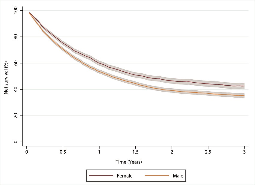 All participants contributed a total of 9,317 years, and 4,478 deaths were observed. The Median follow-up time was 0.8 years (min: 0.2 years, max: 3.0 years). 3-year net survival was 36.8% (95% CI: 35.5-38.1). Net survival at 1 and 2 years was 55.8% (95% CI: 54.7-56.9) and 41.2% (95% CI: 39.9-42.4), respectively.