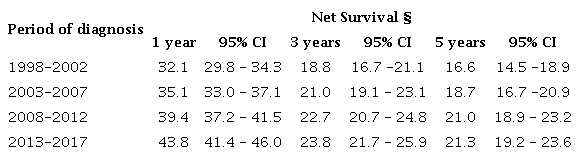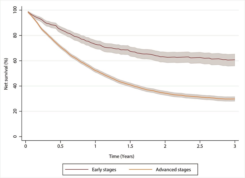On the other hand, net survival was significantly higher in people diagnosed at early stages (IA, IB, IIA, IIB) (58.1%; 95% CI: 54.5-61.5), compared with those at advanced stages (25.1%; 95% CI: 23.4-26.9) (log-rank type p < 0.001) (supplementary Figure S1). Net survival was also significantly higher in people aged <60 years (33.9%; 95% CI: 31.9-36.0), compared with those aged ≥60 years (38.4%; 95% CI: 36.7-40.1) (log-rank type p < 0.001).