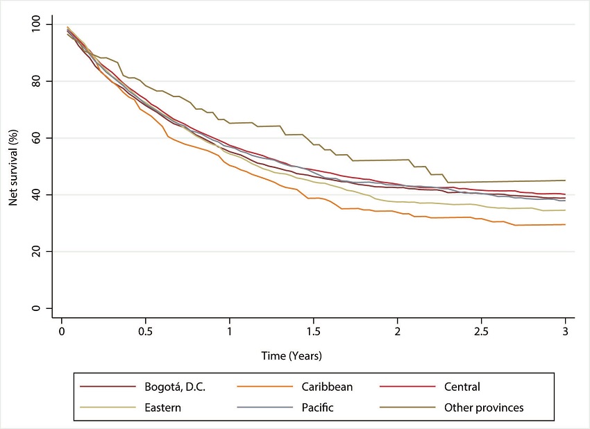 Therefore, we aimed to estimate 3-year net survival at the national level in people treated within the framework of the national health system during the period 2015-2019, with data from NCIS managed by the CAC; and 5-year net survival in Cali from the Population-based Cancer Registry of Cali (RPCC in Spanish) during the period 1998-2017.