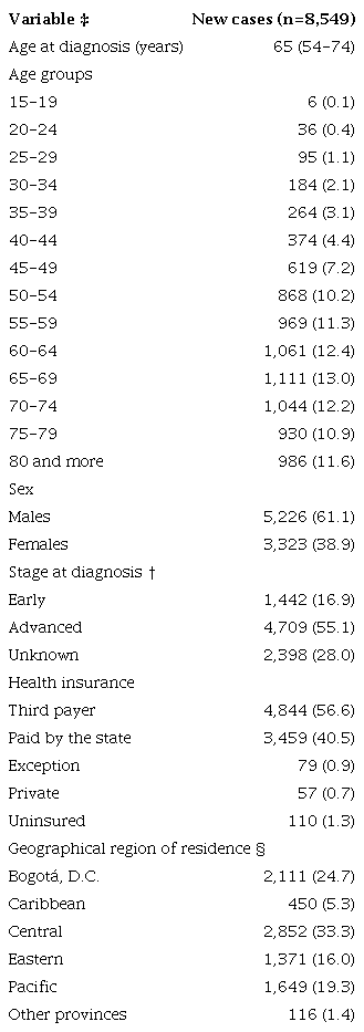 A total of 8,549 people reported from 2015 to 2019 met the inclusion criteria and were analyzed. Demographic and clinical characteristics of new cases of stomach cancer at baseline are shown in Table 1. Most cases occurred in men above 50 years, affiliated with the third payer insurance, living in the Central Region, and diagnosed in advanced stages.