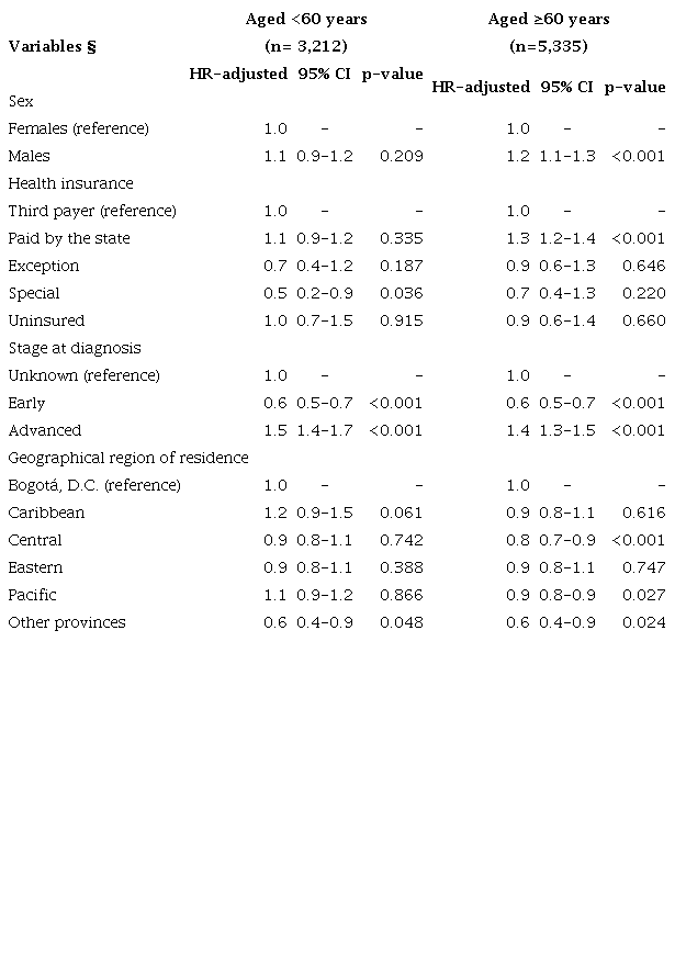 Overall, people under state insurance were at a higher risk of death those affiliated to the third payer (adjusted HR=1.2, 95% CI: 1.1-1.3; p <0.001). Otherwise, people with special insurance had a significantly lower risk (adjusted HR=0.6, 95% CI: 0.4-0.9; p= 0.022). Regarding sex, men had a significantly higher risk of death than women (adjusted HR=1.2, 95% CI: 1.1-1.2; p <0.001). Furthermore, people diagnosed at early stages had a lower risk of death than those with unknown staging (adjusted HR=0.6, 95% CI: 0.5-0.7; p <0.001). The age-stratified model showed a higher risk in men aged ≥60 years. Furthermore, older people with state insurance risk was also higher than younger people. The effect of early detection remained the same despite age (Table 2).