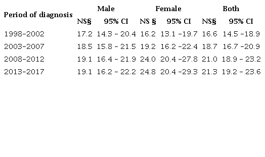 The 20-year survival was estimated by combining the cohort analysis approach for the periods 1998-2002, 2003-2007, and 2008-2012, and the period analysis for the interval 2013-2017 due to the lack of complete five-year follow-up information for all subjects 34,35. 5-year net survival was calculated by using the Pohar-Perme estimator 29. Life tables for all-cause mortality in the general population in Cali were built from the number of deaths and population by age, sex and calendar year 35,36. Survival estimations were age-standardized using the international cancer survival standard weights (group 1) 37.