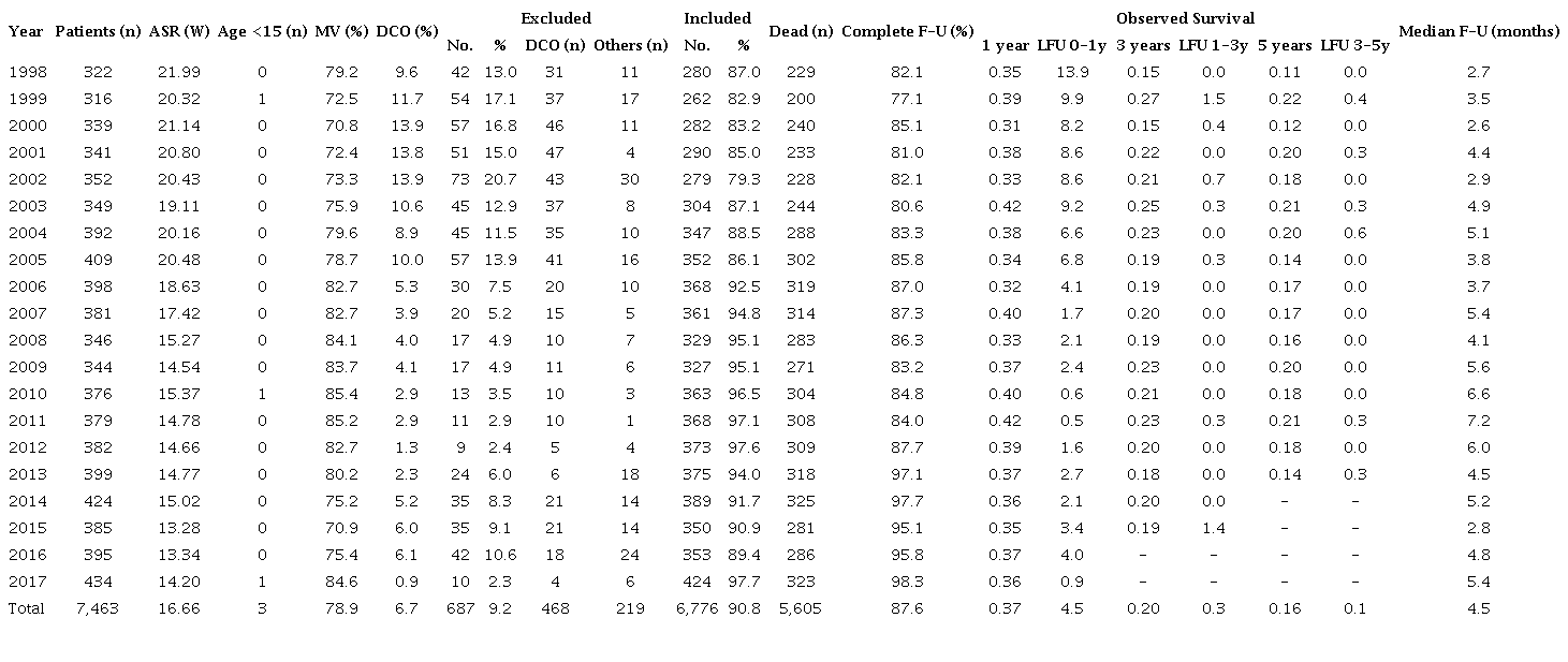 Cases with the following conditions were excluded from the analysis: i) cancer diagnosis only based on death certificates, showing the same date for both diagnosis and death, and ii) other causes: unknown age or sex and benign tumors. In the supplementary Table, S1 has summarized the quality indicators for cases.