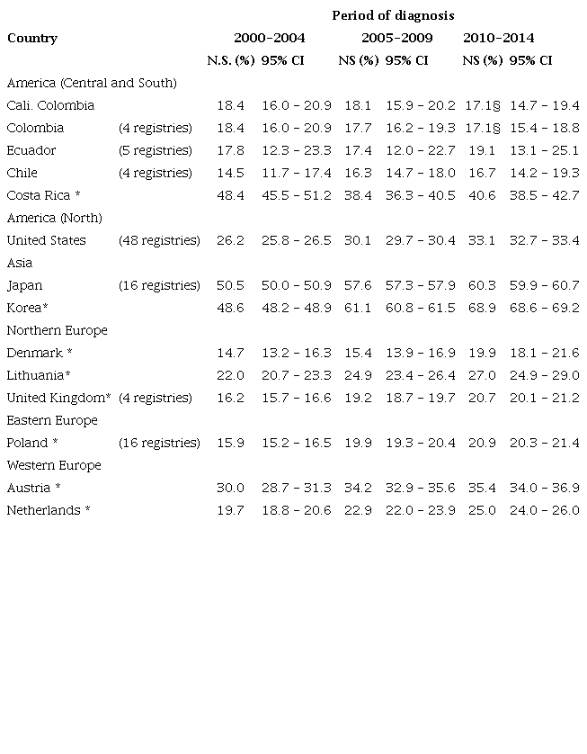 Survival is one of the most interesting indicators for cancer surveillance and control because it reflects the effectiveness of prevention and treatment. Associated factors with stomach cancer survival are diverse; and could be related to the individual, the disease itself, and the health system 5. However, the key prognostic factor is staging at diagnosis, and it depends on a well-organized screening population program. Japan and Korea have significantly improved stomach cancer control through nationwide screening programs that can detect up to 70% of new cases in the early stages 6-8. In Latin America, the screening coverage is poor, with low cost-effectiveness of the implemented programs 5,9-11; and about 90% of people are diagnosed in advanced stages.