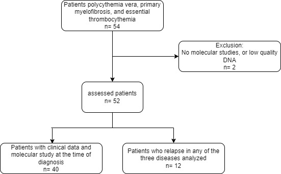 Fifty-four people with this pathology were included in the study, of whom two were excluded because there were no molecular studies because low quality of samples (Figure 1). Twenty-seven patients (51.9%) were men and 25 were women (48.1%). The average age was 58 years (SD: 15.8), with a minimum of 16 and a maximum of 87 years, where primary myelofibrosis presented at a later age of diagnosis (age value = 68.25 years) (Table 1). The most frequent diagnosis was essential thrombocythemia with 20 patients (38.46%), followed by primary myelofibrosis with 16 patients (30.76%) and polycythemia vera with 13 patients (25%). However, 3 (5.76%) patients could not be classified into one of the diagnoses and were classified as having non classifiable BCR-ABL1-negative chronic myeloproliferative neoplasms. Significant differences were found in the hemoglobin level, hematocrit level, hematocrit, and platelet count among the three neoplasms (p= <0.001). Patients diagnosed with polycythemia vera had the highest hemoglobin and hematocrit levels, essential thrombocythemia patients had the highest platelet count, and primary myelofibrosis patients had the lowest hemoglobin levels (Table 1).