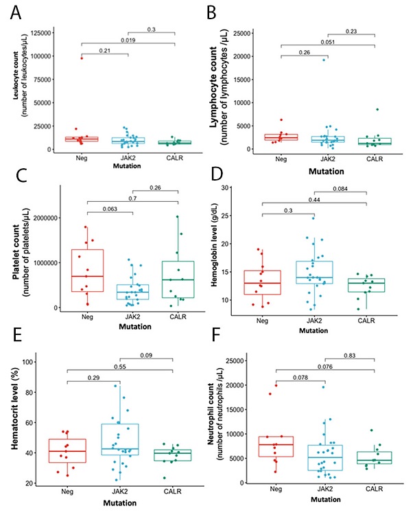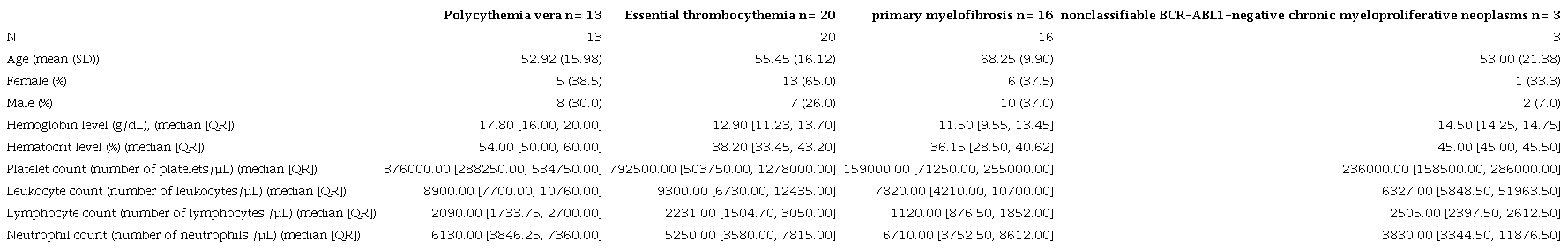 The results are shown as absolute frequencies and percentages for categorical variables (sex, JAK2 mutation, CALR mutation, MPL mutation, and triple-negative mutation) and medians and interquartile ranges (25th percentile and 75th percentile) for quantitative variables (hemoglobin level, hematocrit level, platelet count, leukocyte count, lymphocyte count, neutrophil count). Comparisons among the JAK2, CALR, and triple-negative mutation groups and different types of neoplasms concerning hematological results were made using the Kruskal-Wallis test. Paired group comparisons were made using the Mann-Whitney U test. For all the analyses, the R environment (R Core team 2021) version 4.0.5 (2021-03-31) and Rstudio Version 1.4.1106 were used 14.