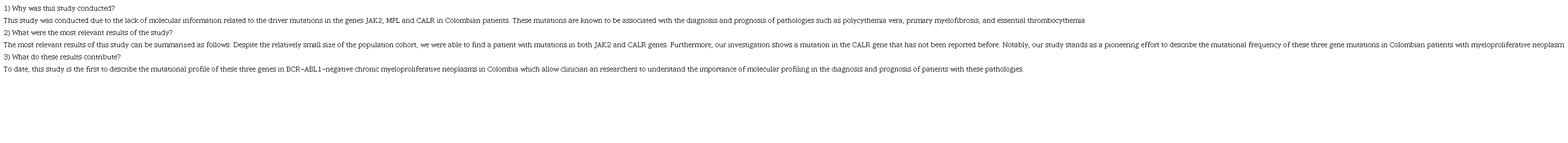 Conclusiones: Así, este estudio demuestra la importancia de la caracterización molecular de las mutaciones JAK2, CALR y MPL en pacientes colombianos (cuyo contexto genético aún no está claro en las neoplasias antes mencionadas) para lograr un diagnóstico certero, un buen pronóstico, un manejo adecuado y una mejoría del paciente. supervivencia.