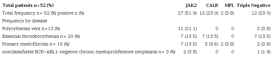 Resultados: La mutación JAK2V617F la portaban el 51.9% de los pacientes, la mutación CALR el 23.0% y la mutación MPL el 3.8%; El 23.0% fueron triple negativos para las mutaciones analizadas. En estas neoplasias se identificaron seis tipos de mutación en CALR, uno de los cuales no ha sido reportado previamente. Además, un paciente presentó una doble mutación tanto en el gen CALR como en el JAK2. En cuanto a los resultados hematológicos para las mutaciones, se encontraron diferencias significativas en el nivel de hemoglobina, el nivel de hematocrito y el recuento de plaquetas entre las tres neoplasias.