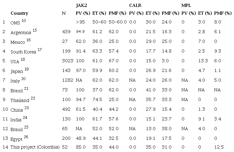Conclusion: Thus, this study demonstrates the importance of the molecular characterization of the JAK2, CALR and MPL mutations in Colombian patients (the genetic context of which remains unclear in the abovementioned neoplasms) to achieve an accurate diagnosis, a good prognosis, adequate management, and patient survival.