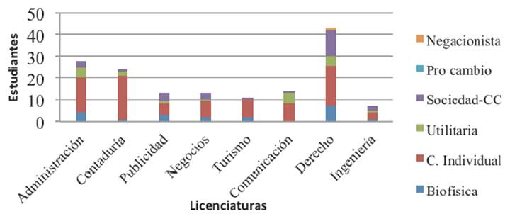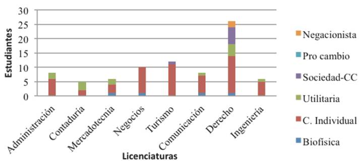 Por su parte, los estudiantes de la UV (Figura 2) presentan una mayor diversificación en la existencia de RS en casi todas las licenciaturas; en las que hay mayor consenso son turismo, contaduría y comunicación, y la RS conciencia individual es la que más predomina. Debe resaltarse que la carrera de turismo en esta última universidad, a diferencia de las otras licenciaturas, no presenta existencia de RS utilitaria; al respecto, debe mencionarse que en el discurso de los estudiantes se observó que los elementos periféricos últimos están en función de la protección y conservación de áreas naturales; aunque quizá su finalidad está orientada a la permanencia o rescate de sitios turísticos, no han mencionado afectaciones de ningún tipo.