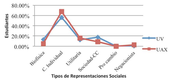 En la Figura 3 se presenta el comparativo de los tipos de representación existentes en ambas universidades, revelando la similitud entre ellas y la predominancia de la representación conciencia individual en ambos grupos.