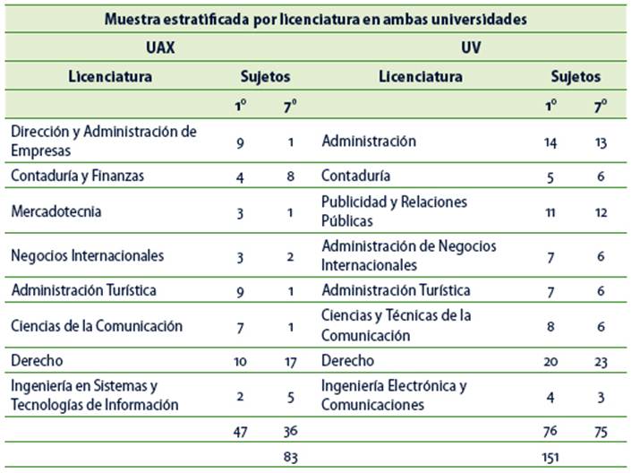 La población de estudiantes se delimitó tomando los estudiantes de primero y séptimo bloque de las licenciaturas que formarían parte del estudio, por lo que de la UAX eran 157, mientras que de la UV se tenían 2,852. Se ubicaron universitarios de estos semestres debido a que se consideró conveniente acercarse a aquellos con reciente inserción al contexto universitario y comenzando sus estudios profesionales, y a quienes ya habían cursado más del 70% de la carrera. Lo anterior, por contemplar a la escuela como un entorno donde tienen lugar interacciones sociales en que se construye la RS y por la información que de ella pudiera emanar en torno al CC. Posteriormente, se determinó una muestra probabilística estratificada a la cual se le aplicarían las cartas asociativas, resultando un total de 234 estudiantes (151 de la UV y 83 de la UAX). Se decidió determinar esta muestra para que el número de instrumentos aplicados fuera representativo en relación con la población y con un nivel de confianza del 90.54%, el cual se considera óptimo para la validez del estudio. Para ello se decidió tomar en cuenta a estudiantes de primero y séptimo bloque, debido a que la reciente inserción de aquéllos en el contexto universitario podría determinar también diferencias en la representación que se tiene sobre el tema en comparación con quienes ya habían cursado más del 70% de los créditos de cada programa educativo; con esto sería identificable la diferencia, si es que existía, a partir del contexto escolar del cual forman parte. La Tabla 1 presenta la muestra por cada una de las licenciaturas que se abordan en el trabajo.