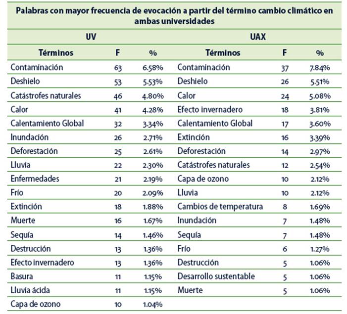 Aunque los estudiantes están conscientes de la existencia de un grave problema global, no se refleja cercanía al no contar con información local sobre el cambio climático. Esto se afirma ya que lo único que emerge de su entorno cercano son las variaciones climáticas radicales que observan cotidianamente en la ciudad de Xalapa y sus alrededores. Las imágenes y términos ubicados en los polos y otros países están mejor posicionadas que las que pueden presentarse en el lugar en que habitan. Al respecto, sólo ubican situaciones de emergencia y desastre como las inundaciones.