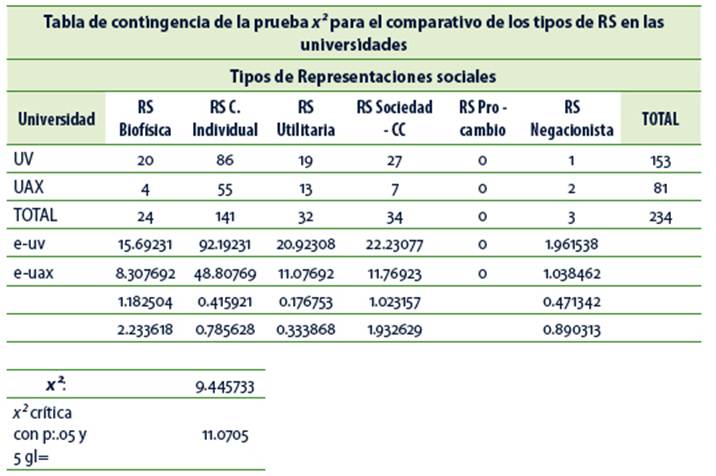 Con las frecuencias obtenidas se elaboró una prueba x cuadrada (Tabla 3) a partir de la que se pudo comprobar estadísticamente que no existen diferencias significativas en los tipos de RS que tienen los estudiantes de la UAX con los de la UV, habiéndose obtenido una x2: 9.445733 en comparación con una x2 crítica: 11.0705 al .05 de error. Esta prueba ofrece la posibilidad de compararlos buscando diferencias, lo que indica que no influye el aspecto socioeconómico y cultural que se supuso intervendría en la representación de los estudiantes de ambas universidades marcando diferencias. Este resultado se apega a la teoría de las representaciones sociales desde el punto de vista que ésta se orienta a buscar los conocimientos compartidos de sentido común que circulan en un grupo, en este caso los estudiantes universitarios; se supuso que por la información que emerge particularmente del contexto escolar público o privado, podría haber variaciones, aunque los resultados evidencian que los aspectos diferentes que emergen de dichos contextos no han influido. En la Tabla 3 se presenta el cálculo de la chi cuadrada para este estudio.