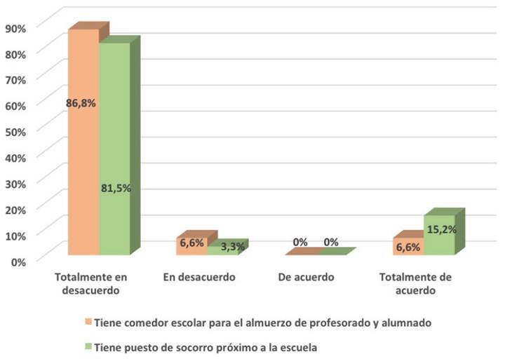 En relación al comedor escolar para la merienda de maestros y alumnos, fundamental para el desarrollo laboral, al tener que desplazarse largas distancias desde el domicilio hasta el centro, prácticamente la mayoría coinciden en que no poseen este tipo de instalaciones (93.4%) (Figura 3). En lo que se refiere al puesto de socorro próximo a la escuela, también de gran importancia ante cualquier incidente que requiera una intervención desde la acción sanitaria, se añaden más dificultades, ya que sólo 15% afirma tener un puesto de socorro relativamente cerca al centro. Sin embargo, la mayoría de docentes coincide en apuntar su inexistencia (84.5%). En cualquier caso, aunque no es competencia del Ministerio de Educación proporcionar tales condiciones sanitarias a la población, sí sería necesario que existiera una colaboración entre el Ministerio de Salud y el de Educación, en función de la situación subyacente (Figura 3).