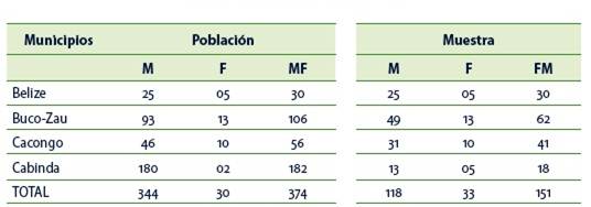 El foco de nuestro estudio, la provincia de Cabinda, pertenece a las 18 provincias de Angola. Es un enclave limitado al norte con la República del Congo (Brazavile), al este y al sur con la República Democrática del Congo y, finalmente, con el océano Atlántico al oeste. Su capital es Cabinda, conocida como Tchiowa, y posee una superficie de 7,283 km2 y con una población cercana a los setecientos mil habitantes (Ceita, 2014). La población pertenece, casi en su totalidad, a los pueblos de Bantu, concretamente al grupo fiote, conjunto específico etnolingüístico compartido por la población.