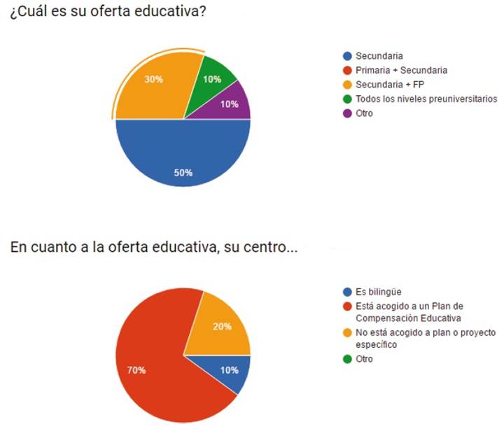 Además, aunque claramente desequilibrada, la existencia de encuestados de centros públicos (80%) y concertados2 (20%) abría la puerta al análisis comparado; no obstante, la heterogeneidad en cuanto a su oferta educativa (4 categorías, desde sólo Educación Secundaria Obligatoria (ESO) hasta incluir todos los niveles preuniversitarios) invita a la reflexión sobre cómo simplificar un análisis cuyo rango de edad estudiantil es tan amplio, y cuyos condicionantes psicopedagógicos son tan cambiantes (especialmente desde primaria a bachillerato y formación profesional).