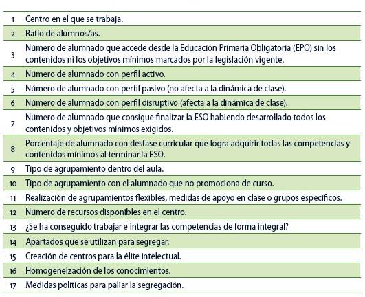 Con el instrumento de recogida definido en estos términos, los datos de encuesta reflejaron como quejas más frecuentes la falta de medidas políticas efectivas para detener la segregación en las aulas y el déficit de recursos disponibles; también que, siempre según el valor medio de las respuestas ofrecidas por docentes y directivos, 20% del alumnado que llega a los centros de secundaria lo hace sin las competencias y los contenidos mínimos necesarios de la etapa anterior. Por ello, se concluyó en un primer análisis, parecía que las medidas para corregir los desfases curriculares no estaban siendo eficaces, debido a la falta de inversión, de profesorado y de recursos, como factores clave más reiterados.