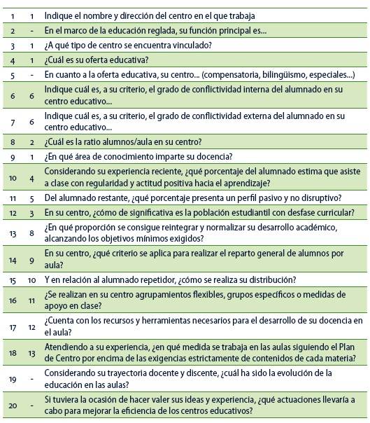 El primer cuestionario se compone de un total de diecisiete preguntas, organizadas en varios bloques lógicos no secuenciales: identificación del centro y funciones del docente entrevistado, descripción de magnitudes (población estudiantil, ratios, oferta educativa), políticas de actuación del centro para las agrupaciones de clase, valoración de las actitudes discentes en clase, de los recursos disponibles para gestionar la atención a la diversidad, así como cuestiones para el juicio de valor sobre la situación educativa. El instrumento así organizado quedó como se muestra en la Tabla 1.
