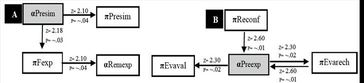 B-Secuencia PE: Cuando los practicantes respondían confirmando cierta información, los alumnos preguntaban explicando; posteriormente los practicantes podían realizar una evaluación validando (πReconf=>αPreexp=>πEvaval) o rechazar el saber expuesto por los estudiantes en sus preguntas, formado así post-expansiones no mínimas (αPreexp<=>πEvarech), hasta que finalmente validaban la información de los estudiantes (αPreexp=>πEvaval), terminando de esta manera con la secuencia PE.