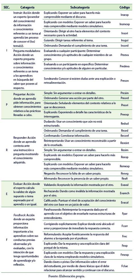 El resultado fue un instrumento en el que se articuló un sistema de categorías y un subsistema verbal cuyo número se definió distinguiendo el núcleo categorial y el nivel de apertura, y para cada una de ellas se extrajeron ejemplos y contra ejemplos de las grabaciones efectuadas. Las categorías se construyeron con base en las secuencias discursivas propias del IRE/F (Intervención-Respuesta-Evaluación/Feedback) y el PE/F (Pregunta-Evaluación/Feedback).