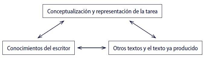 A partir de otros trabajos de investigación sobre los procesos de escritura —Flower (1979), Bereiter y Scardamalia (1987) y Camps, Milian, Pérez, Ribas y Castelló (2001, citados en Castelló 2007)— y sobre la escritura académica (Castelló, 2000), Castelló (2007) distingue tres variables implicadas en la composición de textos académicos: la representación de la tarea, el conocimiento previo del escritor y las exigencias del texto y de otros textos escritos anteriormente (Figura 1). Éstas actúan de forma simultánea durante la producción textual. Las relaciones que establece el sujeto entre ellas y la posibilidad de concientizarse de su influencia determinan el proceso de escritura y definen el texto que obtenemos como producto final.