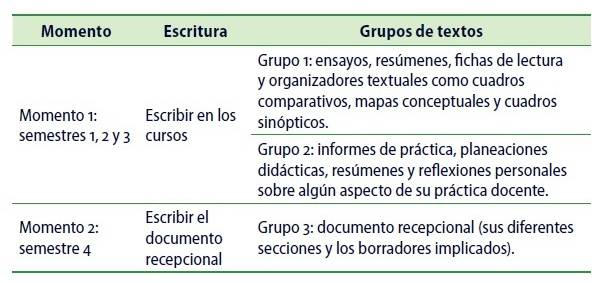Según la clasificación (Tabla 1), los textos del primer grupo se utilizan en otros momentos de la escolaridad como la preparatoria y la licenciatura. Incluso son comunes en varias disciplinas, al menos en la forma de enunciarlos. En cambio, los textos del grupo 2 están más relacionados con la formación docente, en especial con temas de reflexión sobre la práctica; es decir, disciplinarmente son más específicos que los primeros. En el grupo 3 está el documento recepcional. Un género característico de los posgrados profesionalizantes en educación, que se utilizó como modalidad de titulación en las licenciaturas en educación primaria y preescolar en los Planes de estudio 1997 y 1999, respectivamente.