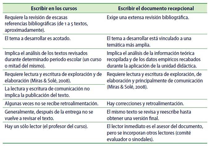 Los dos procesos de escritura plantean exigencias distintas. Si bien hay textos más o menos específicos de la disciplina, escribir para las clases conlleva procesos de producción distintos a los implicados al escribir el documento recepcional. Veamos las tres últimas filas de la Tabla 2.