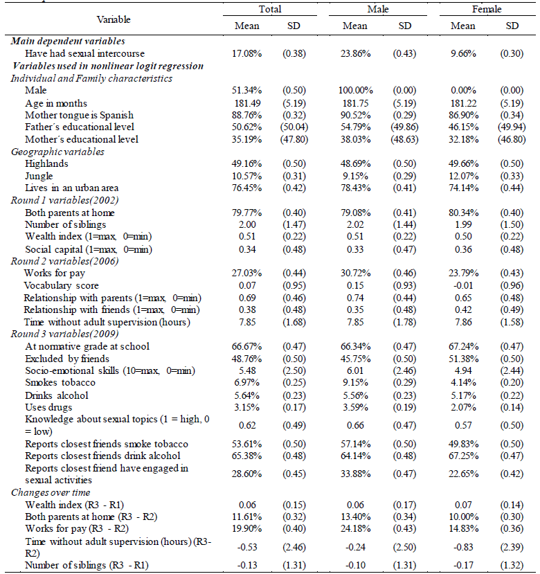 By the time Round 3 survey was administered, youth responding the survey were 15.1 years old on average, with half a year standard deviation; 17.1% of them reported having had sexual intercourse. We also asked these adolescents about the method used in their last sexual encounter: 65% reported using a condom, 10% reported using other methods, 14% said they had not used any protection and a surprising 11% said they did not know if their partner had used any method of protection. While we do not have additional data to explain the latter result, it seems plausible that they do not know because they trusted in their partner to use a contraceptive method or did not dare to ask. This would indicate lack of communication between partners, a result that has been reported in the international literature (Chirinos et. al., 1999; Flórez, 2005; Marston & King, 2006). In this study, we did not have enough statistical power to study the determinants of protected sexual behavior, which would seem a highly relevant analysis for program design. This variable should be available from Round 4 of Young Lives, administered by the time children were 18 years of age. Table 1 presents the descriptive statistics of the sample used in the empirical analysis.