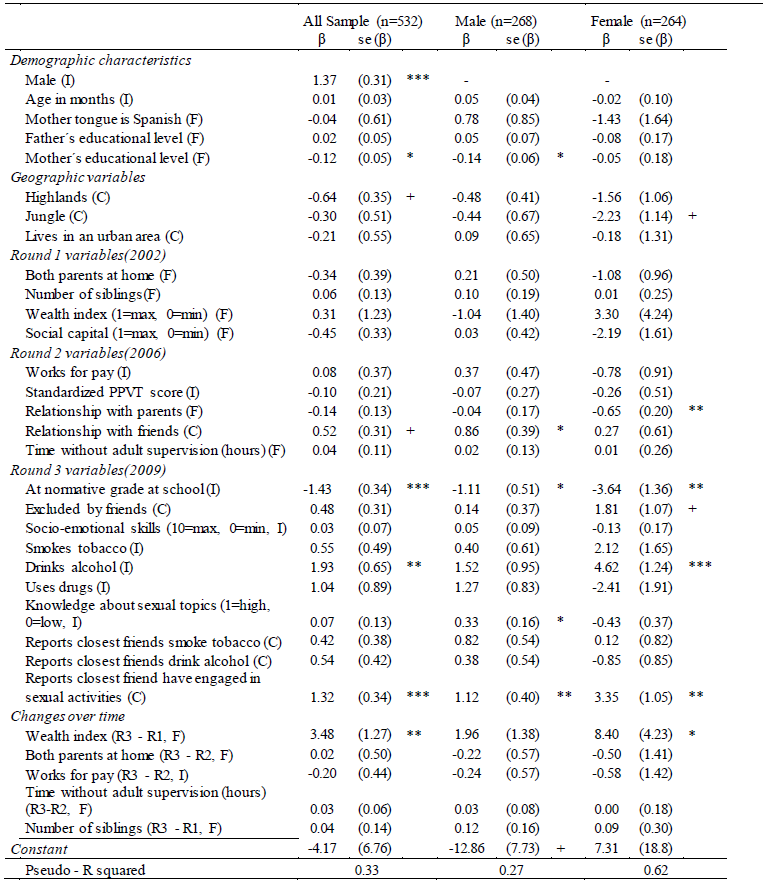 None of the Round 1 variables (administered around the time children were between 8 years old) were associated with having had sexual intercourse by age 15. From the Round 2 variables (administered by the time children were age 12), relationship with friends was associated positively with having had sex for the whole sample (but only significant for boys); at this age also, we found a negative association with relationship with parents, but only for women. Several Round 3 variables were associated with sexual initiation: we found a negative effect of being at the normative grade in school for both sexes. In addition, for the whole sample we found that reporting drinking frequently alcohol was associated with having had sex (but non-significant for boys). For both sexes, having friends who had had sex was positively associated with the dependent variable. Knowledge of sexual topics was associated positively with having had sex but only for men. Feeling excluded by friends was positively associated with having had sex but only for females. Finally, among those variables were we could estimate changes over time, we found that increments in the wealth index from round 1 to round 3 was positively associated with the probability of having had sex; the effect was significant for the whole sample and for females, but not for males.