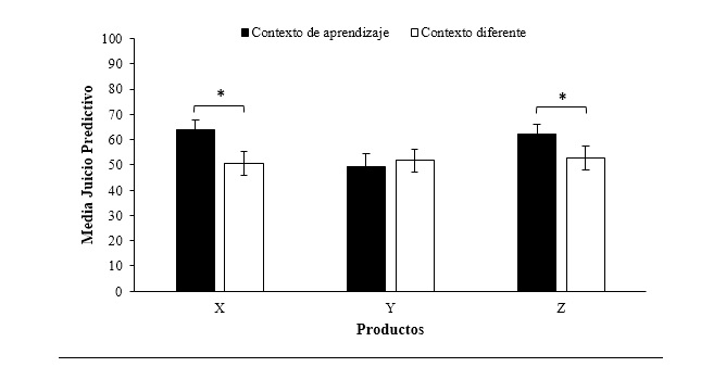 En la figura 3 se muestra el juicio emitido por los participantes en la fase de prueba, cuando se presentaron los productos X, Y y Z en el mismo contexto en el que se entrenaron (contexto de aprendizaje) y en el contexto alternativo, pero igualmente familiar (contexto diferente). El ANOVA de 3 (productos X, Y y Z) x 2 (contexto igual y diferente) mostró efecto principal de contexto [F (1, 34) = 8.65; MSE = 2400; η2 = 0.203; p = 0.006], y de la interacción producto x contexto [F (2, 68) = 3.24; MSE = 1213; η2 = 0.087; p = 0.045].