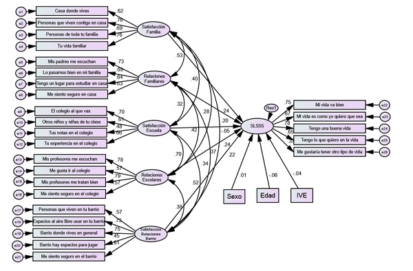 En el MEE 1 se observa que los ítems resultan buenos indicadores de sus variables latentes, con cargas que oscilaban entre .76 y .62 para la satisfacción con la familia, entre .73 y .63 en relaciones familiares, entre .70 y .47 en satisfacción con la escuela, entre .77 y .56 en relaciones escolares y entre .75 y .45 en satisfacción con el barrio. Las cinco variables latentes influyen en la variable endógena (SLSS-5), explicando un 40.1% de la varianza, medida por la correlación múltiple cuadrática mediante AMOS. El factor que ejerce mayor influencia en la satisfacción con la vida es las relaciones escolares (.24), seguido por la satisfacción con la familia (.24), la satisfacción con el barrio (.22) y las relaciones familiares (.19). La satisfacción con la escuela (-.04) no mostró influencia significativa sobre la satisfacción con la vida de los estudiantes, presentando signo negativo.