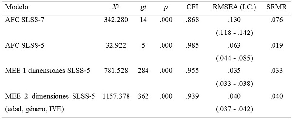 El AFC se realizó en AMOS v24 con dos versiones de SLSS que varían según la cantidad de ítems. En la Tabla 1 se observa que para SLSS-7 los índices de bondad de ajuste no se encuentran en los rangos considerados aceptables por la literatura científica. En cambio, la SLSS-5 muestra buenos índices de ajuste en CFI y SRMR y moderados en RMSEA. El Alfa de Cronbach en la versión de cinco ítems de la SLSS fue de .70 lo que se considera un valor mínimo aceptable (Nunnally y Bernstein, 1994). Las medidas de tendencia central de los ítems de la SLSS-5 son: “Tengo una buena vida” (M=3.38 DE=.93), “Mi vida va bien” (M=3.30 DE=.90), “Tengo lo que quiero en la vida” (M=3.13 DE=1.00), “Mi vida es como yo quiero que sea” (M=2.84 DE=1.15), y “Me gustaría tener otro tipo de vida” (M=2.44 DE=1.51), según las valoraciones que realizaron los estudiantes chilenos en un rango de respuesta de 0 a 4 puntos.