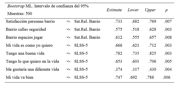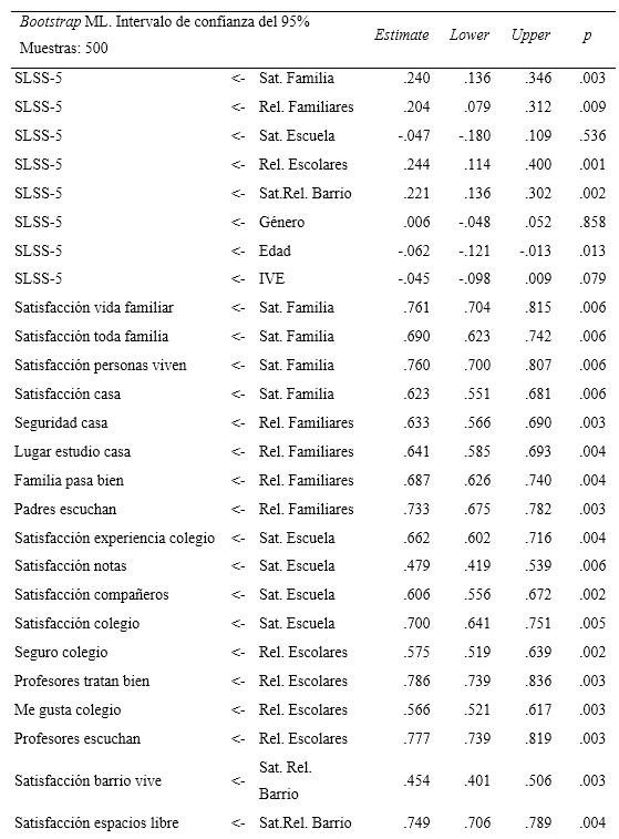En la investigación se probaron diferentes modelos de ecuaciones estructurales (MEE). El primer MEE probó la influencia de las dimensiones satisfacción con la familia, relaciones familiares, satisfacción con la escuela, relaciones escolares y satisfacción/relaciones del barrio sobre la variable endógena (SLSS-5), explicando un 40,1% de la varianza total. Un hallazgo de este modelo fue que la satisfacción con la escuela no contribuyó significativamente a la explicación de la satisfacción con la vida de los estudiantes. Dicho resultado es similar al encontrado por Casas et al. (2015) con adolescentes de Rumania, España, Brasil y Chile.