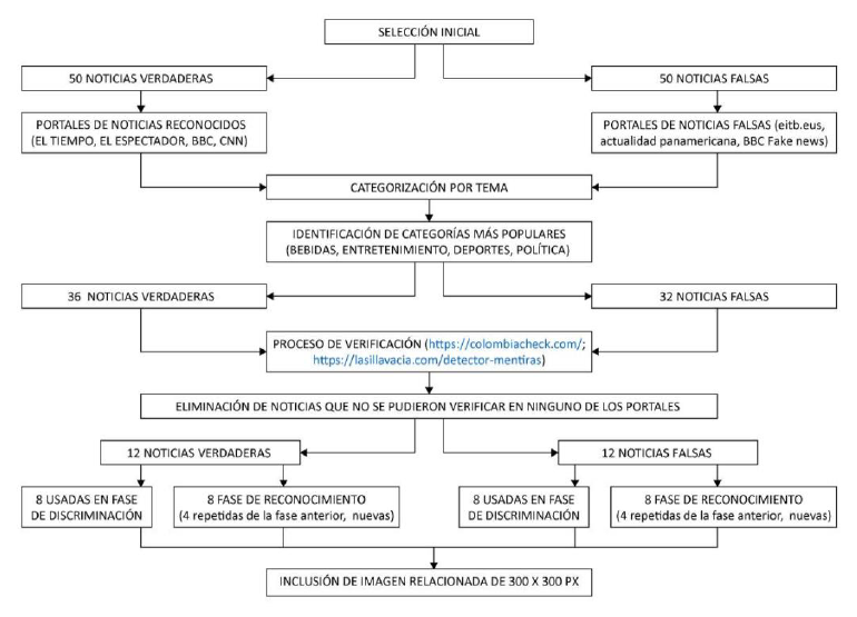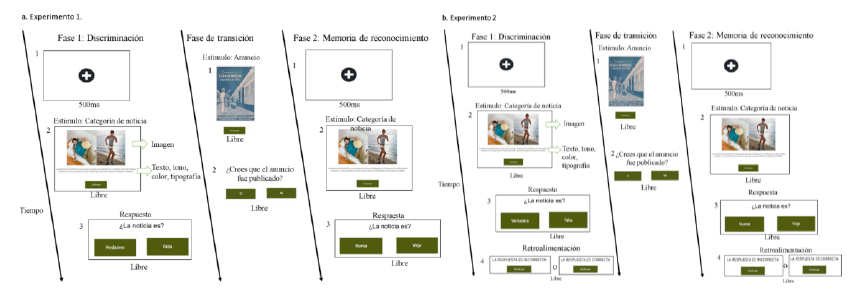 Para lograr los objetivos del estudio, se desarrollaron dos experimentos con un diseño entre sujetos, cada uno dividido en dos fases. Para la primera fase del experimento 1 (discriminación), el diseño de presentación de estímulos estuvo compuesto por 4 categorías de noticias (bebidas, deportes, entretenimiento, política) x 2 condiciones o tipos de noticias (falsa, verdadera) y fueron presentadas x 3 tonos de tipografía (25 %, negro, 50% negro, 75% negro), para obtener 2 dos tipos de respuesta (verdadera vs falsa), para esta fase se presentaron 24 ensayos. En la fase 2 (memoria de reconocimiento), se hizo una variación en la presentación de noticias nuevas (nunca presentadas) vs noticias viejas (presentadas en la primera fase), por tanto, fue un diseño de 4 categorías de noticias (bebidas vs deportes vs entretenimiento vs política) x 2 condiciones o tipos de noticias (nueva vs vieja). Fueron presentados 8 ensayos. Para el experimento 2, la variación fue retroalimentar el desempeño de los participantes en las dos fases. (Ver esquema del diseño experimental Figura 4).