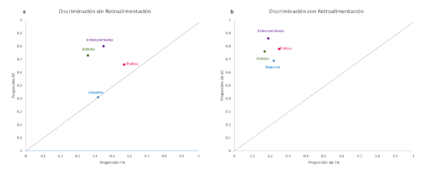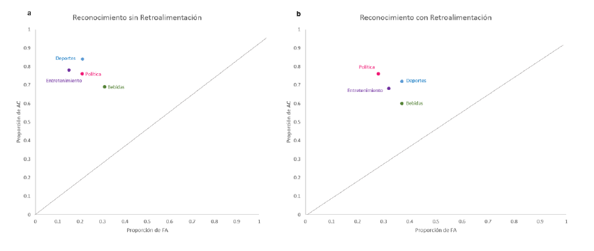 La Figura 7a presenta la curva ROC de reconocimiento sin retroalimentación para cada una de las categorías de noticias durante la fase 1. Se presentan altos índices de memoria de reconocimiento para cada una de las categorías, sin embargo, estos altos índices presentan un sesgo en la toma de decisiones entre las diferentes categorías; para las categorías de bebidas y deportes, se observa una tendencia a indicar que todas las noticias son nuevas, incluidas las viejas. Para las categorías entretenimiento y política hay una tendencia a indicar que todas las noticias son viejas incluidas las nuevas. (Véase índices d´ y C, fase 2 experimento 1, Tabla 3).