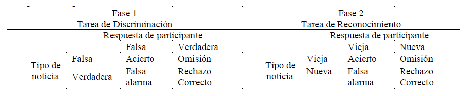 También, se tienen en cuenta las Omisiones (OM) que en la fase 1, representan que las noticias falsas, son discriminadas por el participante como verdaderas; en la fase 2, representan que las noticias viejas, son discriminadas por el participante como nuevas. Por último, los Rechazos Correctos (RC) indican en la fase 1, que las noticias verdaderas, son discriminadas por el participante como verdaderas; en la fase 2, las noticias nuevas son reconocidas por el participante como nuevas (ver Tabla1).