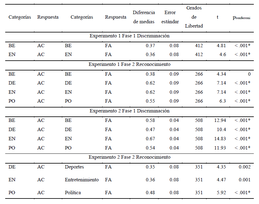 Estas observaciones se vieron confirmadas por ANOVAS de medidas repetidas: 4 categorías de noticias x 4 tipos de respuestas, se encontró efecto principal de tipo de respuesta F (3, 120) = 40.50, MCe = .39, ηp2 = .50, p <.001. No se evidenció efecto principal de categoría p = 1. La interacción de categoría x tipo de respuesta resultó estadísticamente significativa, F (9, 360) = 2.88, MCe = .07 ηp2= .06, p = .003. Los análisis post hoc muestran diferencias significativas entre FA vs AC y OM vs RC (ver Tabla 2). Resultados reportados demuestran que las personas presentan un nivel alto de memoria reconocimiento entre las diferentes características no físicas de las noticias. El sesgo en la respuesta por categorías, indica que se producen procesos de interferencia en la memoria de reconocimiento, por lo que se acepta lo planteado en la H2.