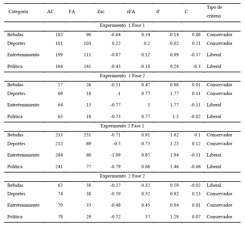 Por otro lado, los resultados encontrados en el experimento 1, evidencian una baja discriminación tanto de las noticias falsas como las verdaderas, resultados que se pueden deber a la competición entre la información almacenada en la memoria y el aprendizaje de nueva información, lo que produce interferencia proactiva (Postman, 1960; Tulving, 1962; Baddeley y Logie, 1999). En este caso, los participantes contrastan la información nueva que se les presenta, con la información relacionada almacenada en su memoria (información aprendida), es decir, usan su memoria como fuente de información para tomar una decisión, lo que genera sesgos de respuesta. Estos sesgos, a su vez facilitan la presentación de incertidumbre, lo que deriva en criterios de decisión liberales y conservadores como los vistos en el experimento 1.