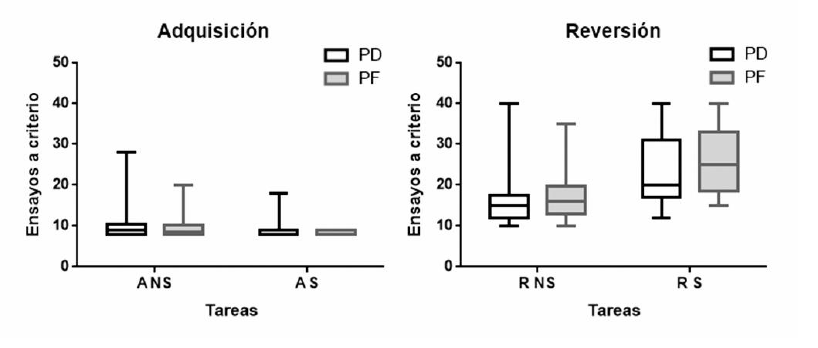 Analizando cada grupo por separado, se encuentran diferencias significativas en el número de ensayos para llegar al criterio en la fase de reversión tanto en el grupo PD (Z = -1.98, p = 0.047 r = 0.51), como en el PF (Z = -2.41, p = 0.016 r = 0.64). De modo consistente con el total de la muestra, ambos grupos necesitaron menos ensayos para llegar al criterio en la tarea no social durante la reversión. Sin embargo, no hubo diferencias significativas en la fase de adquisición (ps > 0.091).