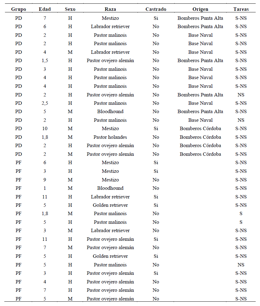 Los perros fueron seleccionados según la variable entrenamiento, conformándose dos grupos: el primero era el de perros entrenados en detección de olores (PD, N=17), ocho de los cuales pertenecían a la Base Naval Puerto Belgrano, Argentina y 9 al grupo de K9 de los bomberos voluntarios de la Ciudad de Punta Alta y del Departamento de Búsqueda y Rescate con Canes de la Federación de Bomberos Voluntarios de la Provincia de Córdoba. Si bien la mayoría vivía en caniles (N = 13), todos tenían un frecuente contacto con su guía. El entrenamiento en general consistía en buscar personas u objetos desaparecidos en un campo abierto donde había obstáculos. Cuando los perros lo hallaban debían señalar la posición ladrando y permaneciendo en el lugar indicado.