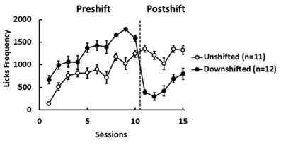 Los procedimientos de contraste sucesivo negativo se basan en la devaluación inesperada y súbita de la cantidad o calidad de una recompensa (Crespi, 1942; Elliot, 1928; Tinklepaugh, 1928). En un diseño típico de CSNc, un grupo de animales (devaluados) recibe acceso diario a una solución de sacarosa al 32% durante diez sesiones (fase de precambio), y luego esta solución se reduce al 4% (o 2% en algunos experimentos) durante cuatro o cinco sesiones adicionales (fase de postcambio). El efecto de esta devaluación se compara con la conducta de un grupo control (no devaluado) que siempre ha recibido acceso a sacarosa al 4% (o 2% según sea el caso). Las ratas devaluadas muestran una supresión transitoria del comportamiento consumatorio en comparación con el grupo control (Figura 1). Este procedimiento experimental implica generar, en los sujetos expuestos a la condición de devaluación, una discrepancia entre la recompensa esperada y la recibida, que genera la reacción emocional negativa causante del deterioro conductual observado (Flaherty, 1996; Papini, 2003).