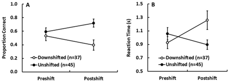 Como variables dependientes se incluyeron medidas objetivas (proporción de aciertos y tiempo de reacción medios registrados en los últimos 5 ensayos de la fase de precambio, y en los ensayos 2 a 6 de la fase de postcambio) y subjetivas (puntuaciones obtenidas en los cuestionarios de evaluación de estado afectivo, específicamente la Escala de Afecto Positivo y Negativo (PANAS; Watson et al., 1988); la Escala de Evaluación del Estado de Ánimo (SMA; Sanz, 2001), y el Maniquí de Autoevaluación (SAM; Bradley y Lang, 1994); administrados antes y después de realizar la prueba cognitiva. Los resultados (Figura 2) mostraron una peor ejecución en el grupo devaluado (mayor número de errores y tiempo de reacción) cuando dicho grupo fue comparado con el control no devaluado en la fase de postcambio, si bien dicho deterioro no se acompañó de cambios significativos en las puntuaciones relativas a estado afectivo positivo y negativo (véase, no obstante, Experimento 3).