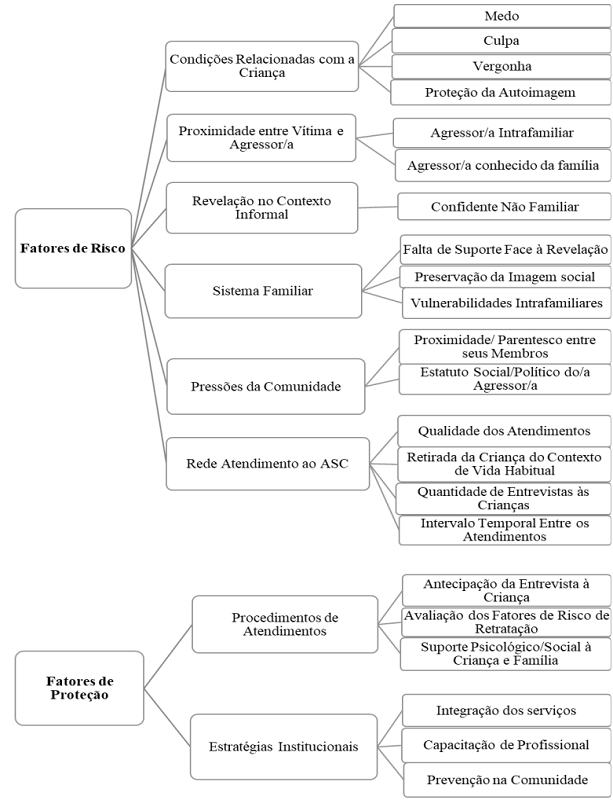 A análise temática das entrevistas resultou em seis temas relativos a fatores de risco associados à retratação: 1) Condições relacionadas com a criança; 2) Proximidade entre vítima e agressor/a; 3) Revelação no contexto informal; 4) Sistema familiar; 5) Pressões da comunidade; 6) A rede de atendimento ao ASC. E dois temas de fatores de proteção: 1) Procedimentos de atendimento. e 2) Estratégias institucionais. Em conjunto, estes temas englobam características da criança e os diversos níveis contextuais que a envolvem, o que traduz uma perspectiva bioecológica sobre a retratação, na medida em que a revelação do ASC é um processo que se estende ao longo do tempo e emerge pela inter-relação da criança com pessoas e contextos ( Alaggia et al., 2017; Fontes, 1993; Katz, 2014).