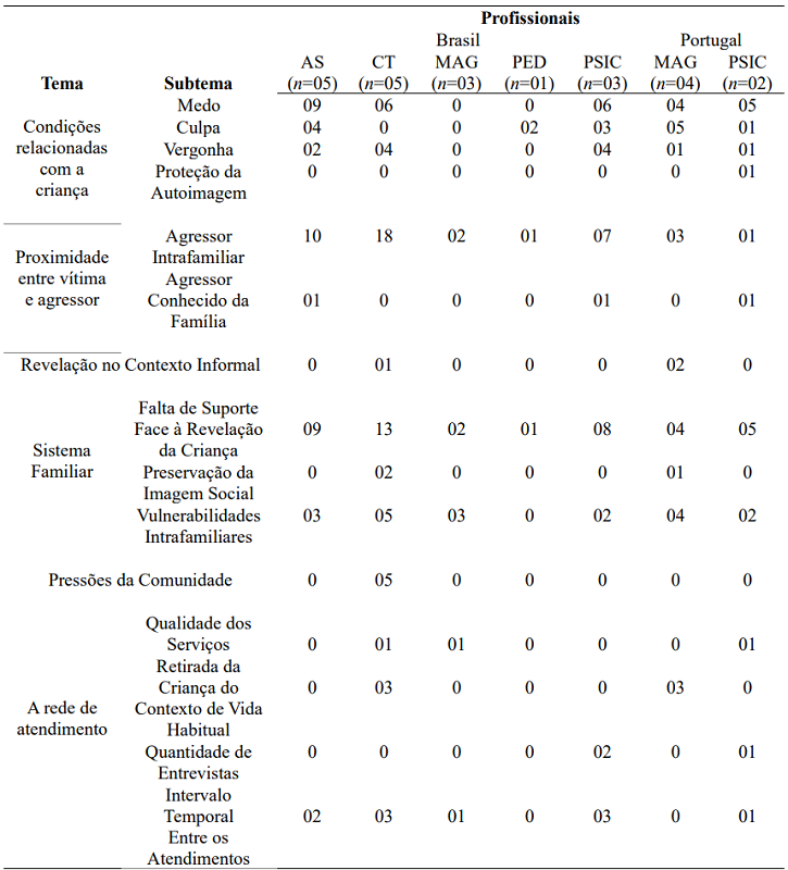 Em síntese, observou-se que, embora os/as profissionais de ambos os países tenham identificado as características emocionais e comportamentais das crianças, somente entre os/as profissionais portugueses emergiu o aspecto da proteção da autoimagem em vítimas do sexo masculino como fator de risco para a retratação. Por outro lado, a temática das pressões da comunidade foi identificada somente entre os/as profissionais brasileiros, mais especificamente os/as conselheiros tutelares. E de maneira homogênea, os/as profissionais de ambos os países identificaram a proximidade entre vítima e agressor/a como fator de impacto sobre o processo de revelação, e que pode levar a uma possível retratação.