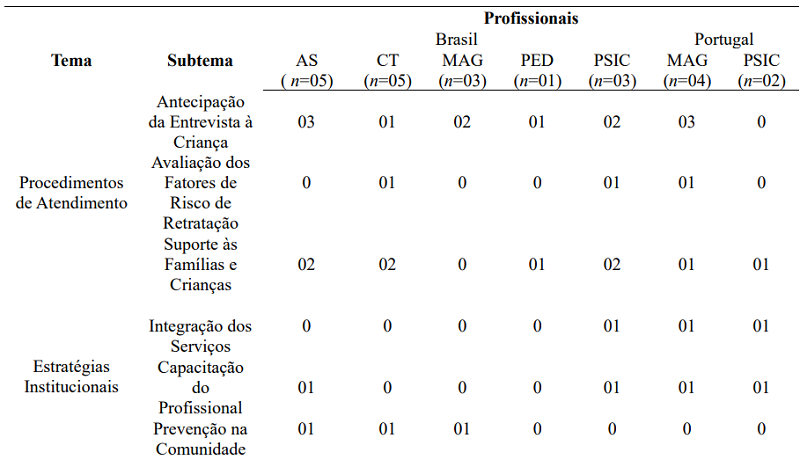Quantidade de Entrevistas Formais à Criança. Os/as profissionais da psicologia, nos dois países, consideraram que a quantidade de entrevistas a que as crianças são submetidas desde a comunicação da suspeita de ASC às autoridades, pode contribuir para o desenvolvimento da retratação:
