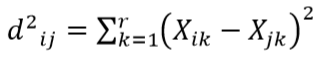 La técnica utiliza medidas de proximidad para determinar el nivel similaridad o disimilaridad de las unidades analizadas, así como criterios de eslabonamiento para la conformación de los grupos. Una medida de similaridad más utilizada es la distancia euclídea al cuadrado la cual puede ser calculada mediante la ecuación 1 con d2ij la distancia entre la muestra i y la muestra j, Xjk el valor de la muestra j en la variable k y r el número de variables y Xik el valor de la muestra i en la variable k (De la Garza García et al., 2013).