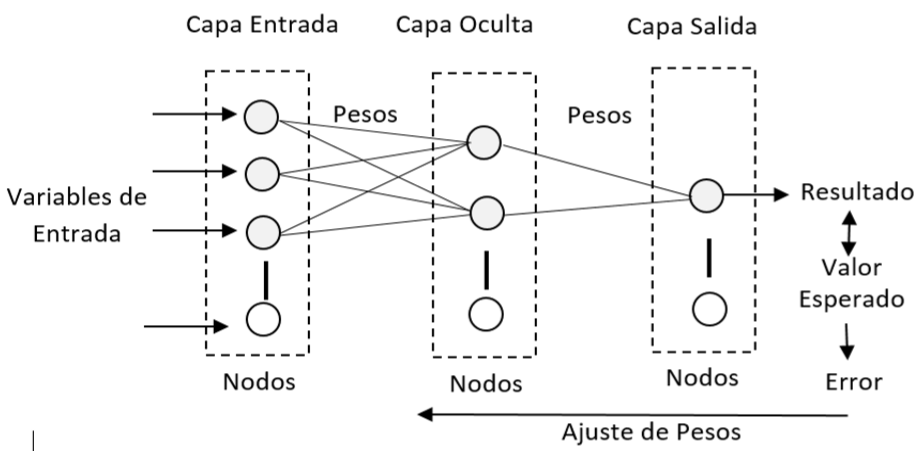 En la Figura 1, la capa de entrada representa los nodos en los que ingresan datos de las variables independientes, en la capa oculta se procesan los datos de entrada y la capa de salida proporciona la salida de los resultados (variable dependiente). El algoritmo compara los resultados observados con los resultados esperados y dependiendo del nivel de error, se ajustan los pesos sinápticos para reducirlo (Caicedo y López, 2009, p.21).
