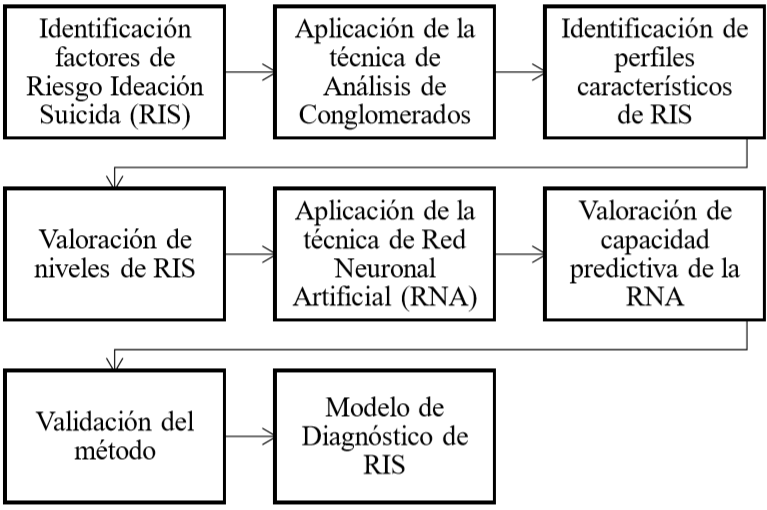 En este trabajo de investigación se desarrolla un método de valoración y pronóstico de niveles de ideación suicida en adolescentes escolarizados mediante técnicas de análisis multivariado. Para lo anterior, revisó la literatura y estado del arte relacionado a la ideación suicida, las técnicas de análisis de clúster y redes neuronales artificiales, para a partir de un análisis racional y empírico definir y estructurar las variables pensamientos, planes y manifestaciones suicidas asociadas al problema objeto de estudio, para lo cual se estructuró un método que integra un análisis de conglomerados para identificar los perfiles de ideación suicida, un análisis de puntuación acumulativa por perfil para definir los niveles de ideación y un modelo de Red Neuronal Artificial -RNA para pronosticar la pertenencia de individuos a niveles de ideación suicida con propósito de diagnóstico.